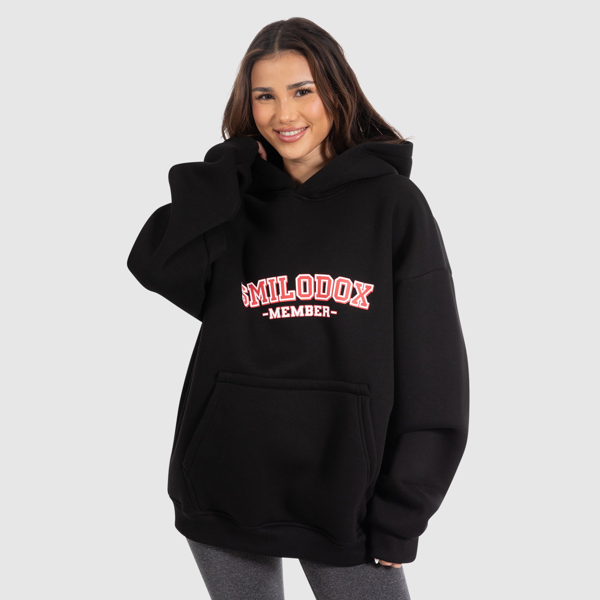 Der Oversize Hoodie. Mit einem auffälligen Big Smilodox Member Print ist er ein echtes Statement-Piece. Hergestellt aus weichem, flauschigem und warmem Stoff bietet er ultimativen Komfort und Wohlfühlfaktor. Die großzügige Kapuze und die Bündchen an Ärmeln und Saum sorgen für eine perfekte Passform. Mit einer praktischen aufgesetzten Kängurutasche ist dieser Hoodie nicht nur stylisch, sondern auch funktional. Ein absolutes Must-Have für jede Gelegenheit.